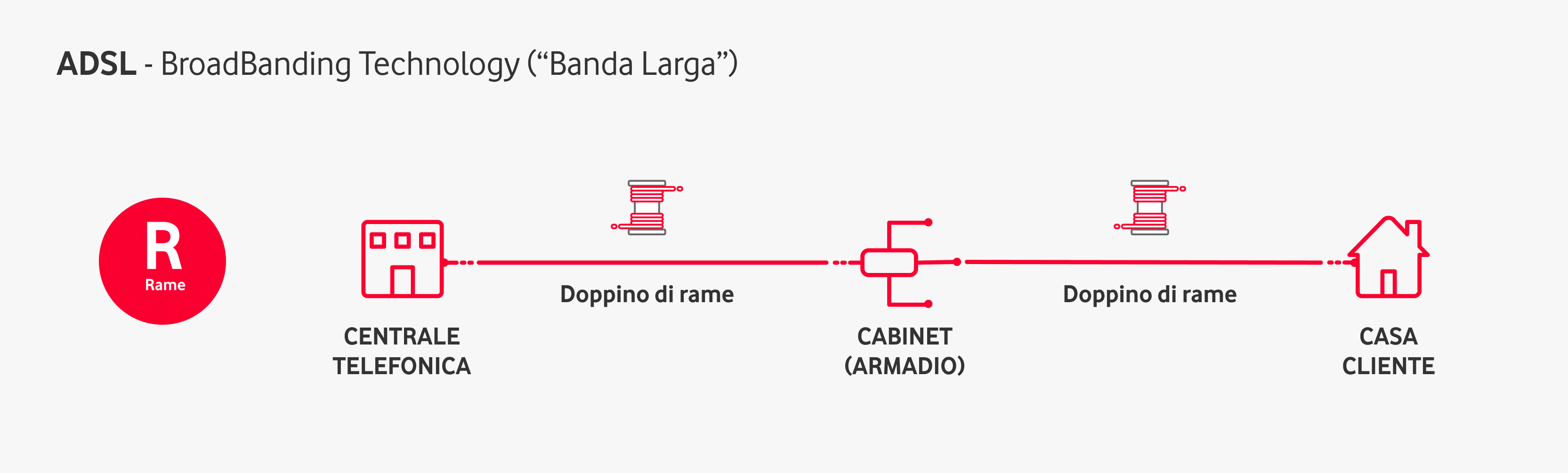 La copertura capillare del territorio con armadi stradali assicura una lunghezza media del doppino in rame di circa 250 metri. A differenza dalla connettività FTTH