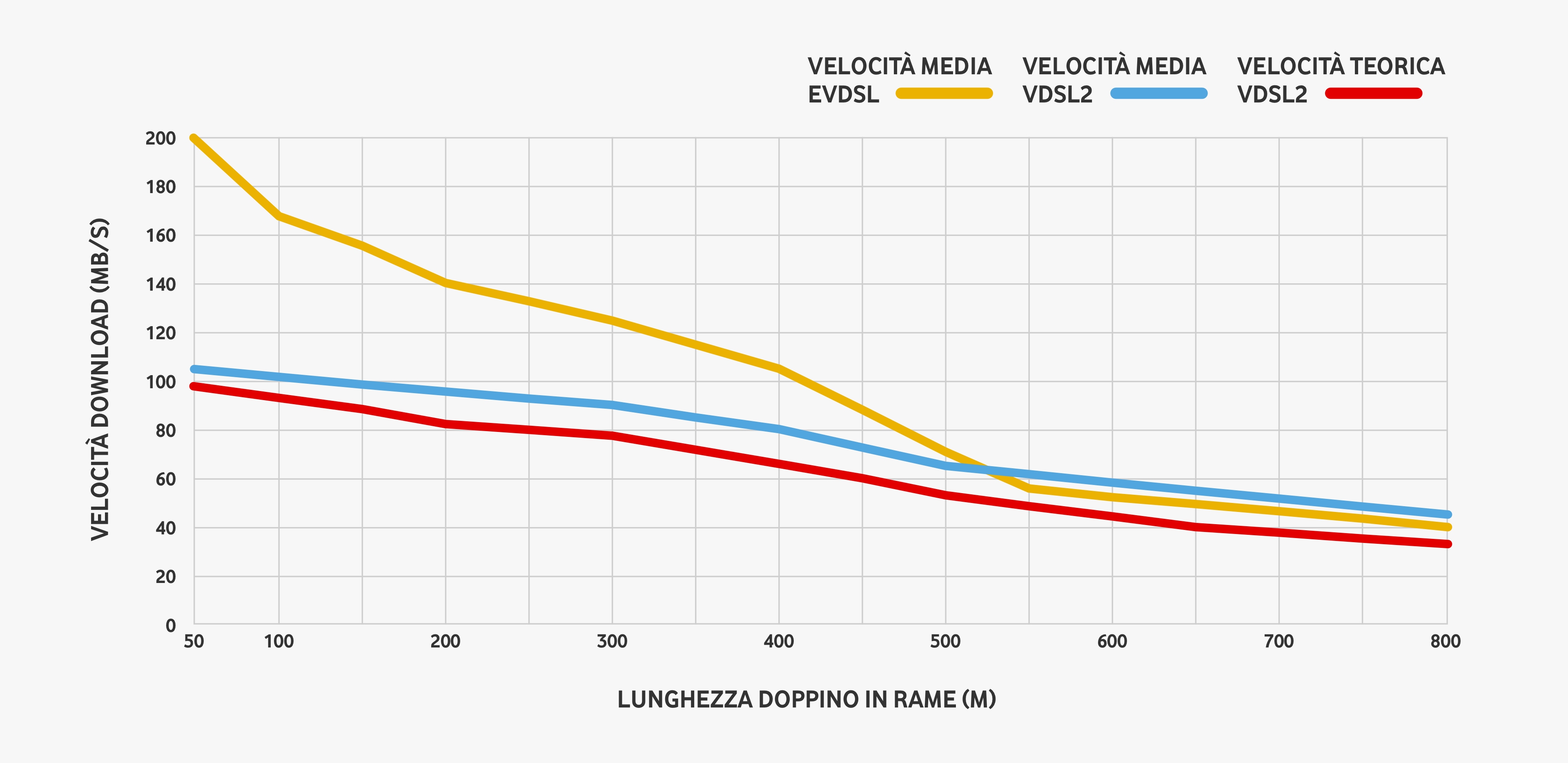 risentono degli effetti delle interferenze elettromagnetiche provocate dai doppini degli altri clienti collegati allo stesso cabinet. Questo fenomeno, chiamato “diafonia”, degrada leggermente le performance teoriche. Il grafico seguente illustra come variano le performance della fibra FTTC