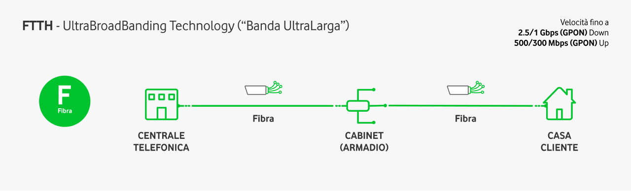 è infatti una tipologia di connessione a banda larga (20 Mb/s) o ultralarga (oltre i 30 Mb/s e fino a 300 Mb/s) in cui i dati, a differenza di quanto avviene per i servizi di Fibra e ADSL