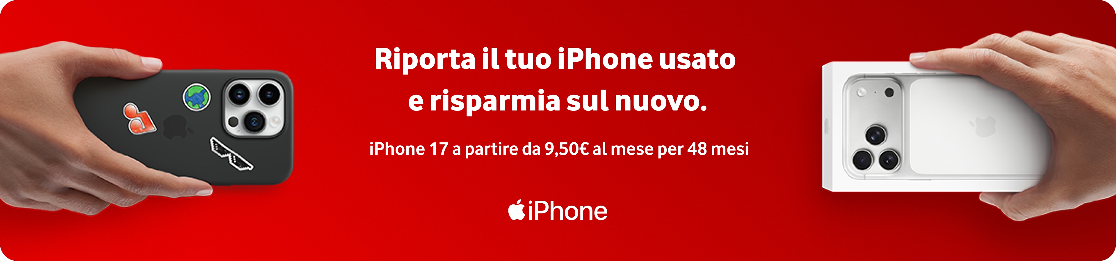 Messaggio pubblicitario con finalità promozionale. Offerta valida fino al 31/12/2025, salvo proroghe. Linea di credito concessa da Compass Banca S.p.A. Fido max 2.000€, utilizzabile, salvo approvazione, esclusivamente per il finanziamento di acquisti di beni o servizi Vodafone. Il contratto ha durata indeterminata e il cliente ha diritto di recedere in qualsiasi momento senza spese. Documenti informativi presso i rivenditori Vodafone che agiscono in qualità di intermediari del credito in esclusiva. Esempio rappresentativo della promozione per i clienti titolari, per l’intera durata del piano di rimborso, dell’offerta di telefonia Vodafone Smartphone Easy SPECIAL EDITION (comprendente Giga, minuti, SMS pagata con Smart Pay, ossia addebitando le ricariche mensili su carta di credito o su conto corrente bancario o su fattura.): Importo del credito utilizzato e dovuto per il rimborso iPhone 17 Pro 256GB 672,00€, TAN FISSO 0,00%, in 48 rate mensili pari a 14,00€. Oneri accessori e spese azzerate. Esempio rappresentativo in assenza di condizioni promozionali o se il cliente disattiva l’offerta Vodafone Smartphone Easy SPECIAL EDITION e non ha ancora completato il piano di rimborso dell’acquisto effettuato godendo delle condizioni promozionali: importo del credito utilizzato per il iPhone 17 Pro 256GB: 672,00€ in 47 rate mensili pari a 18,32€ e una rata pari a 18,78€ TAN FISSO 13,90%, importo totale dovuto per il rimborso dell’acquisto 879,82€. TAEG della linea di credito, calcolato sull’intero Fido: 14,81%, inclusivo di: TAN FISSO 13,90% e oneri fiscali 5€ (a carico di Compass). Oneri accessori e spese azzerate. L’importo totale dovuto per il rimborso rateale degli acquisti è estinguibile anticipatamente in qualsiasi momento rimborsando il saldo residuo in un’unica soluzione, senza interessi o altri oneri. L’importo delle rate indicate negli esempi non include i costi, disponibili in negozio, relativi all’offerta di telefonia Vodafone.